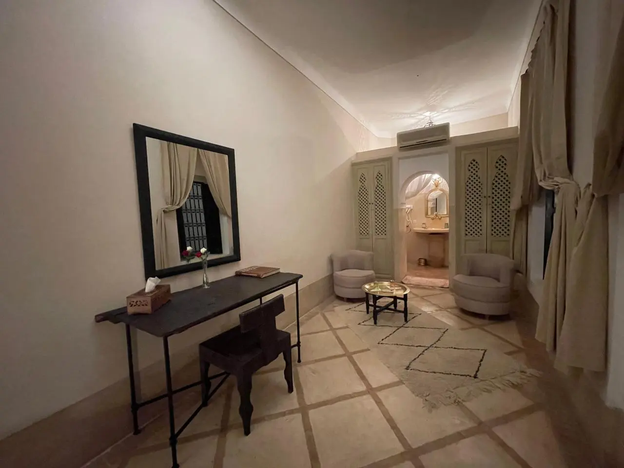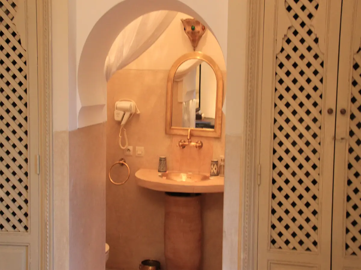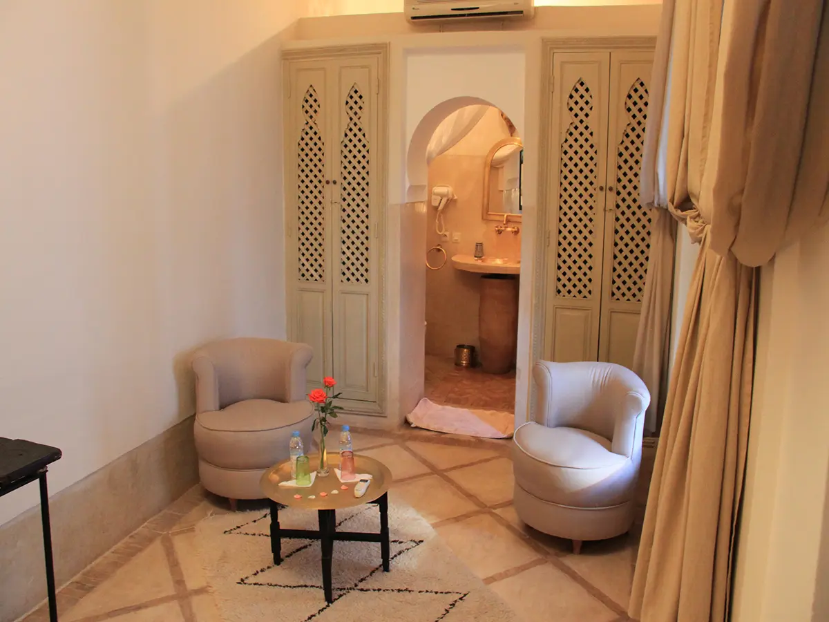 Zahra is an elegant and welcoming room inspired by floral beauty and Moroccan craftsmanship. With its harmonious design, warm touches, and comfortable setting, it offers a serene space to unwind and enjoy the unique spirit of Riad El Gnaouia. Perfect for travelers who appreciate authenticity, comfort, and refined simplicity.